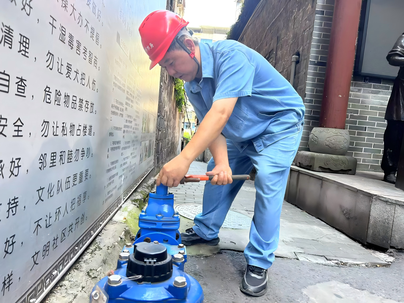 在這支水務(wù)藍(lán)隊(duì)伍里有這樣一位衛(wèi)士——管道維修工張國(guó)彪,他頭頂烈日,腳踏熱土,始終堅(jiān)守城區(qū)管道巡檢第一線。此刻的他正蹲在破裂水管旁,藍(lán)色工裝早已被汗水浸透,緊緊貼在背上。他抹了把臉,任憑汗珠混著泥水滑落,手里的扳手卻一刻沒停,這已是他今天處理的第二個(gè)搶修點(diǎn)。